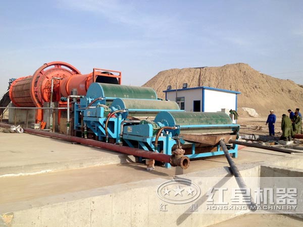 工藝配置:軸承傳動節(jié)能型球磨機(jī)、螺旋分級機(jī)、磁選機(jī)(采用一次粗選,三次精選的磁選工藝流程)、永磁過濾機(jī)